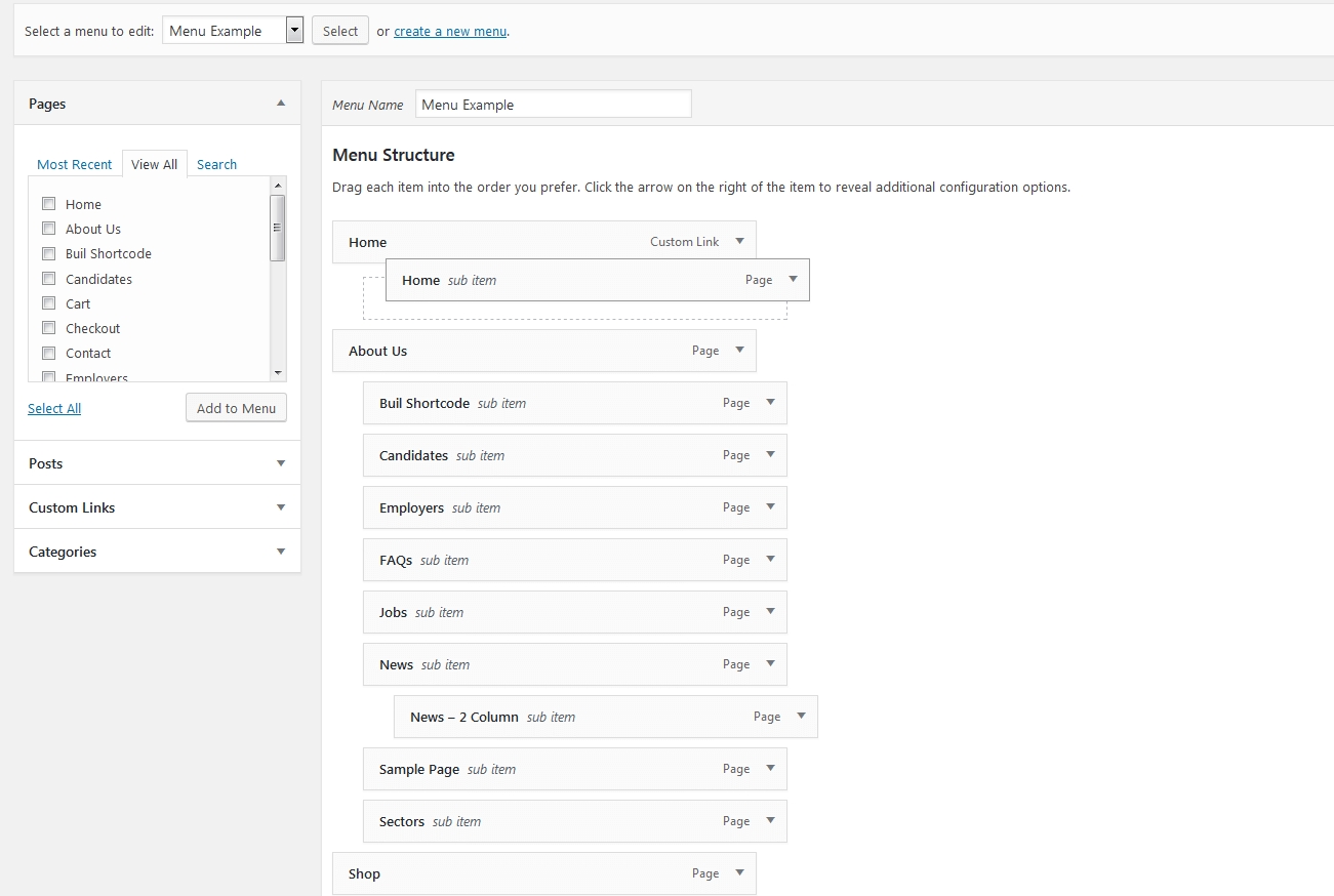 The WordPress menu editor allows you to create multi-level menus using a simple 'drag and drop' interface. Drag menu items up or down to change their order of appearance in the menu. Drag menu items left or right in order to create sub-levels within your menu.
