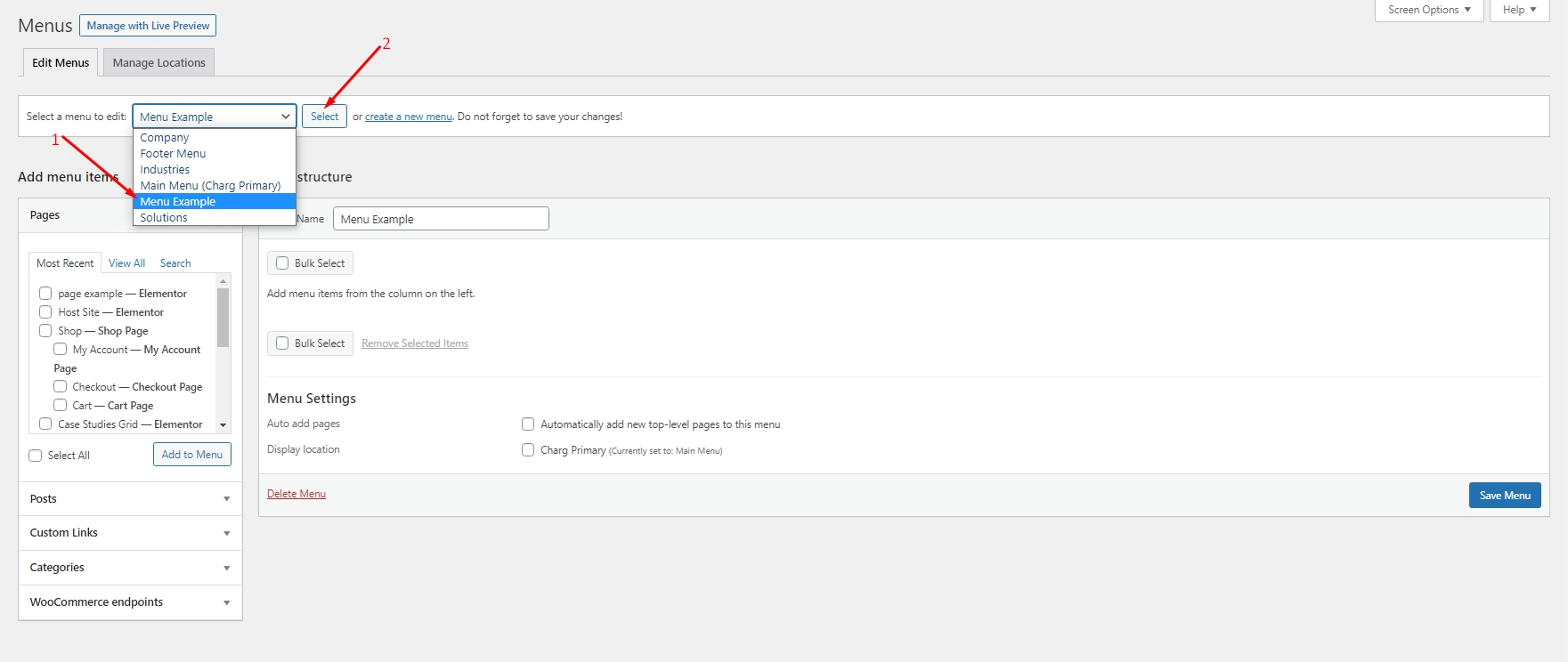 1. From the 'Appearance' menu on the left-hand side of the Dashboard, select the 'Menus' option to bring up the Menu Editor.