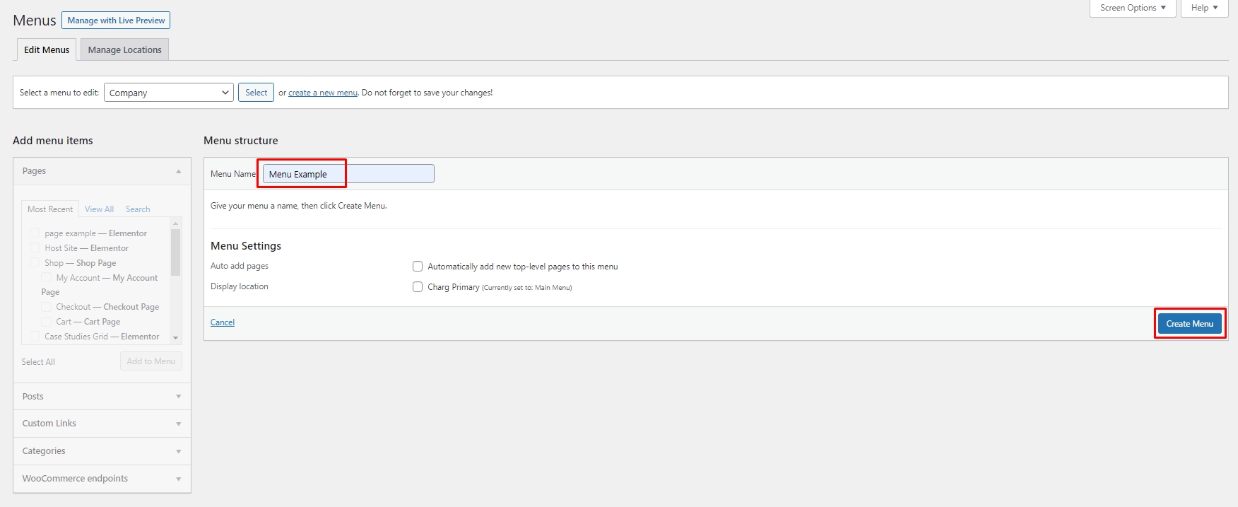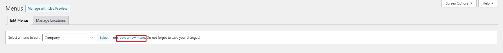 2. Select create a new menu at the top of the page