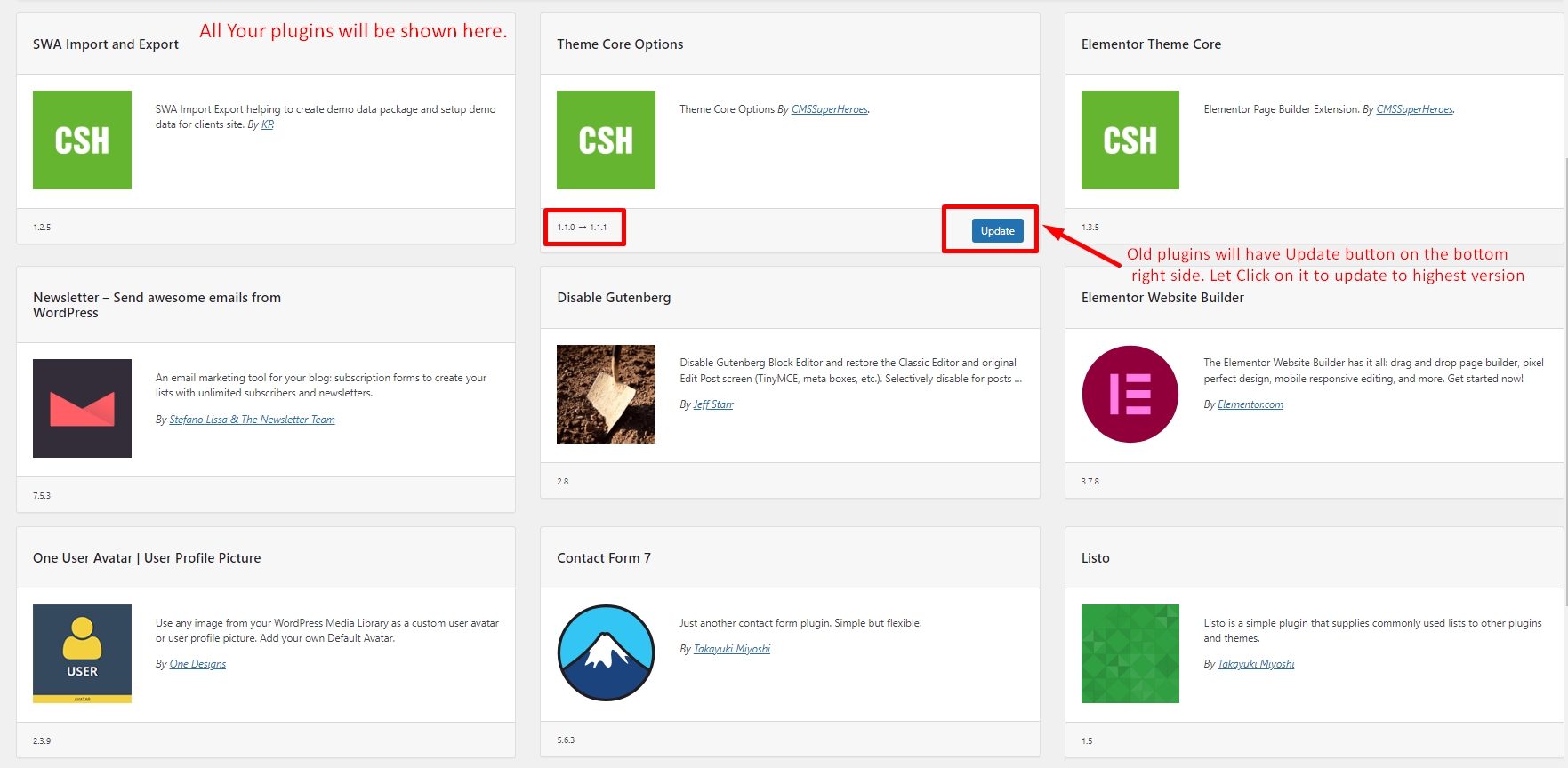 3. When you see the Updated alert show, you are done. Let's continue to do it with other old plugins.