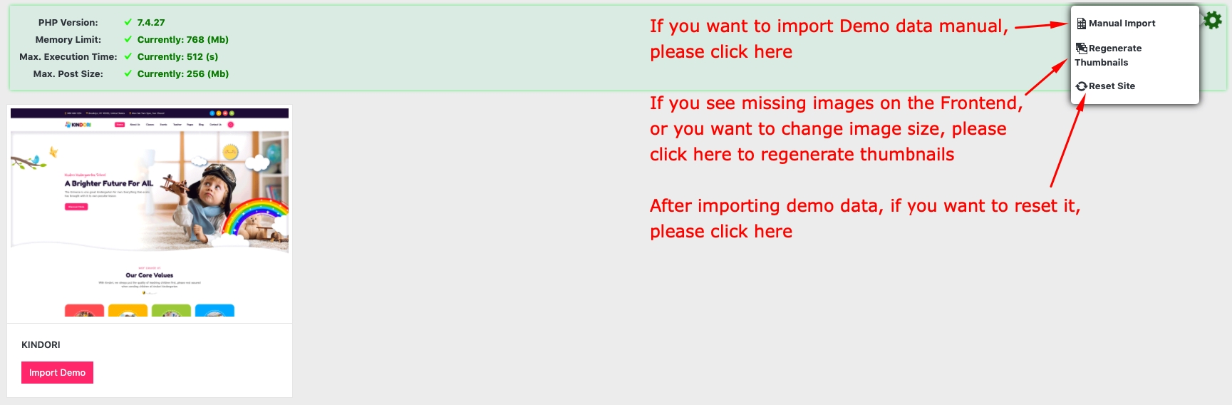 You can view some steps import the demo data manual for the Kindori theme here for more detail: