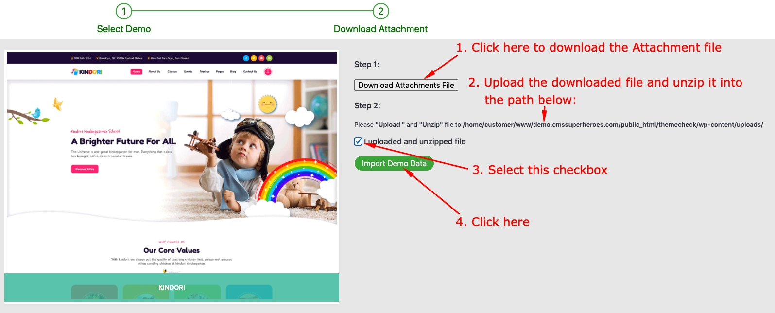 You can view some steps import the demo data manual for the Kindori theme here for more detail: